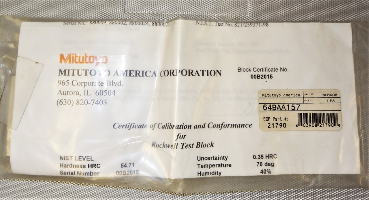 Mitutoyo Rockwell Hardness Test Block 64BAA157 for 50-55 HRC. This item is sealed, never opened and included are the NIST traceable documents.