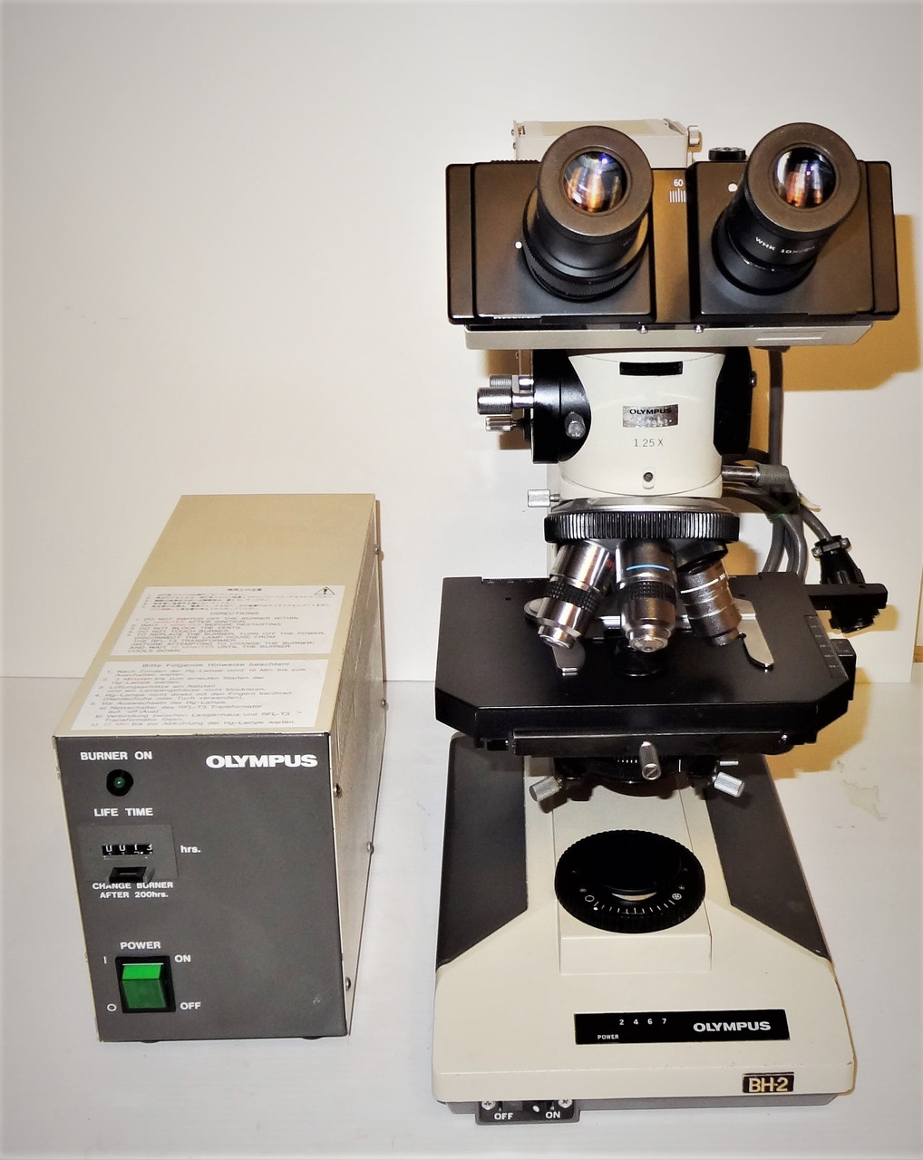 Olympus BH2 compound microscope set up for fluorescence. The microscope has been professionally serviced and carries a 6-month warranty for parts and labor. It comes configured as follows: