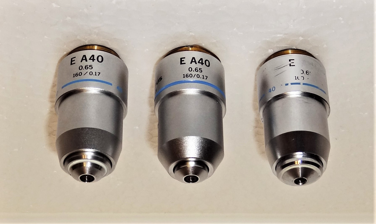 Olympus E A40X microscope objective. The objective is primarily intended to be used on the CH2 microscope but works just fine on the BH2, BHS, BHTU, IMT2, CK and Vanox 160mm TL microscopes. Each objective pictured has been tested and found to be optically perfect and as can be seen the cosmetic condition varies. It has an NA of 0.65 and requires a 0.17 mm thick coverslip. THE SALE IS FOR ONE EACH. Thank You For Looking!