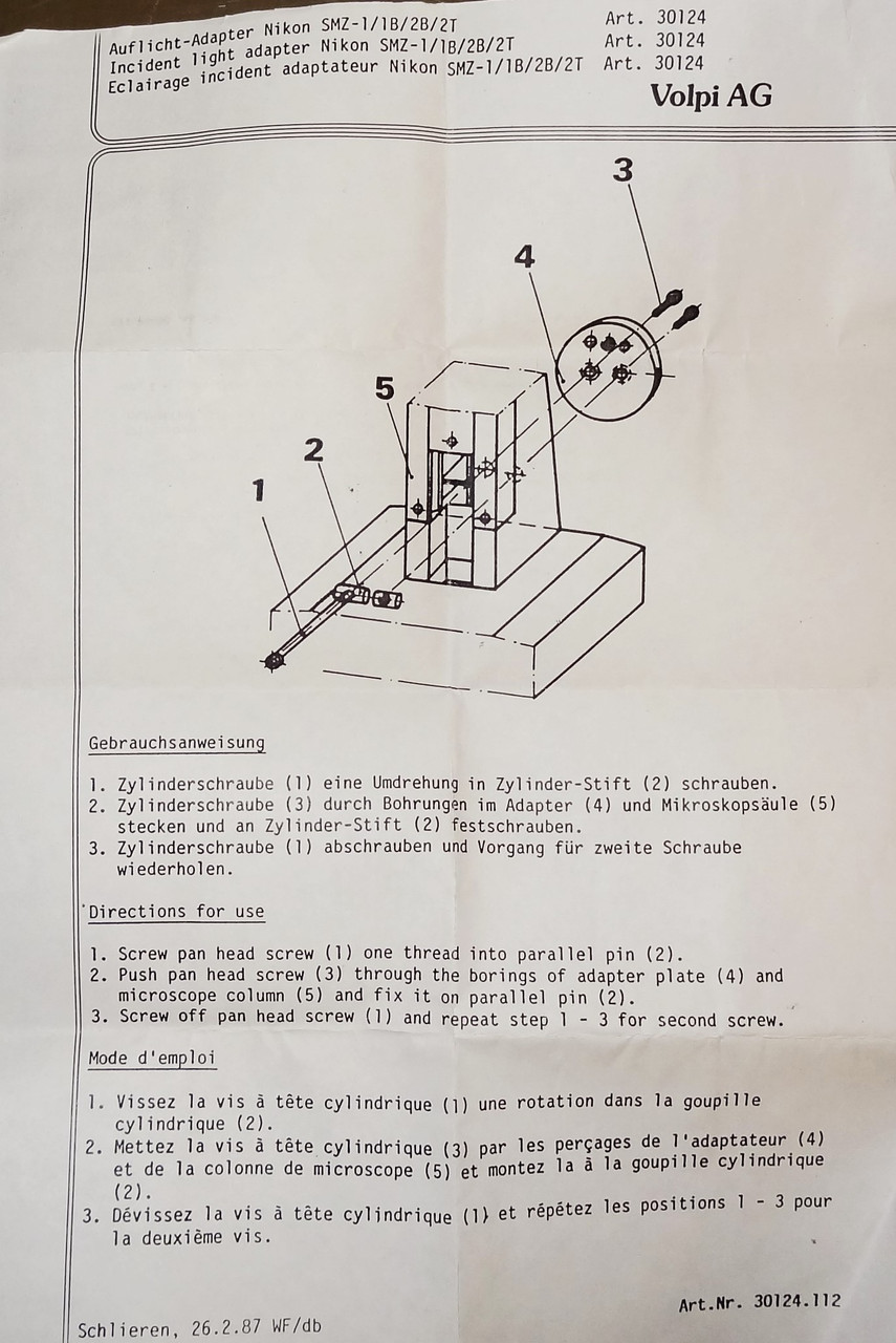 Volpi AG Incident light adapter for Nikon SMZ-1/ 1B/ 2B/ 2T series of microscopes. The Volpi product number is Art. 30124. I know of no other microscopes this adapter will fit, so please do not order unless you have one of the four Nikon stereo microscopes listed. Thank you! |